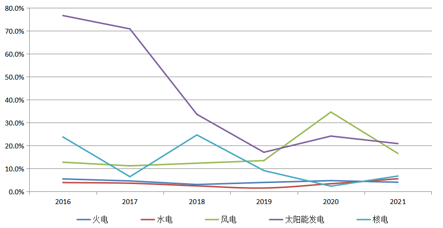 圖6 2016~2021年火電、水電、風(fēng)電、太陽能發(fā)電、核電裝機增速情況