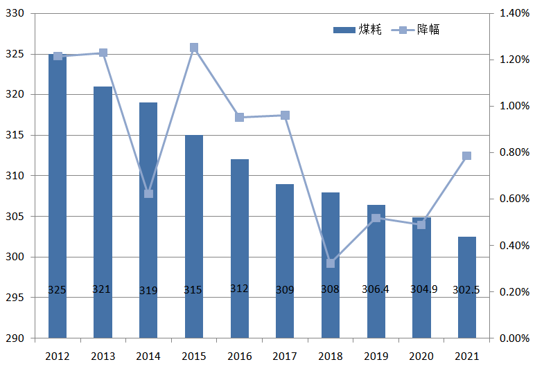 據(jù)國家能源局?jǐn)?shù)據(jù),2021年全國供電標(biāo)準(zhǔn)煤耗302.5克/千瓦時,同比再降2.4克/千瓦時,較2011年下降了26.5克/千瓦時。