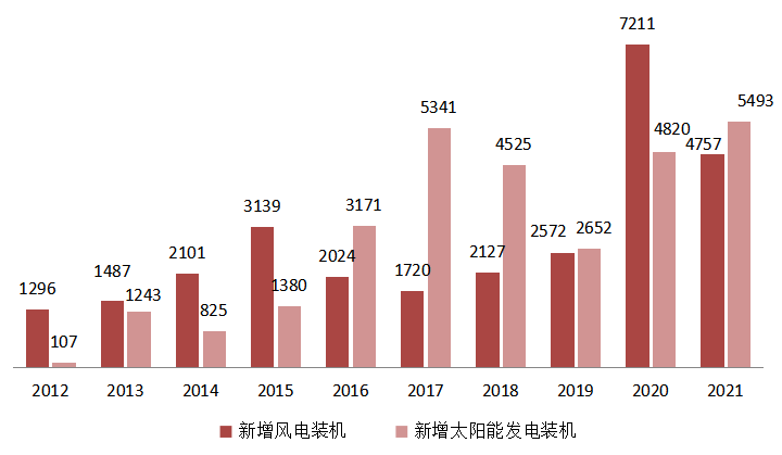 圖10 2012~2021年新增風(fēng)電、太陽能發(fā)電裝機情況(單位:萬千瓦)