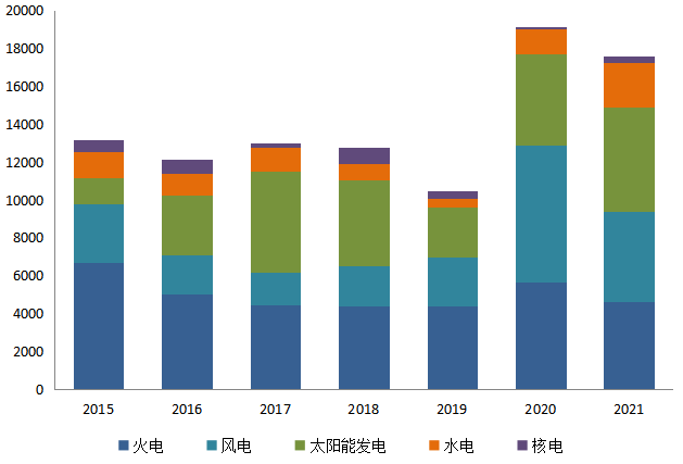 圖8 2015~2021年全國新增電力裝機結(jié)構(gòu)對比(單位:萬千瓦)