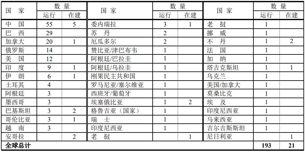就目前而論,世界各國裝機容量在1000MW以上的運行水電站數(shù)為193座,在建的友21座。其中中國運行的裝機容量在1000MW以上的水電站數(shù)達55座,在建的有5座,均居全球首位。