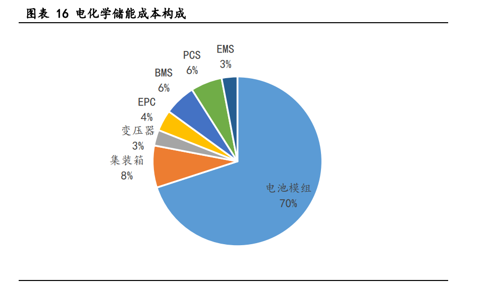 儲(chǔ)能電池系統(tǒng)由電池組和電池管理系統(tǒng)兩部分組成。電池組是整個(gè)儲(chǔ)能系統(tǒng)中成本 占比最高的部分,約占 70%,BMS 占比為 6%,儲(chǔ)能電池系統(tǒng)占電化學(xué)儲(chǔ)能成本比重達(dá) 76%。