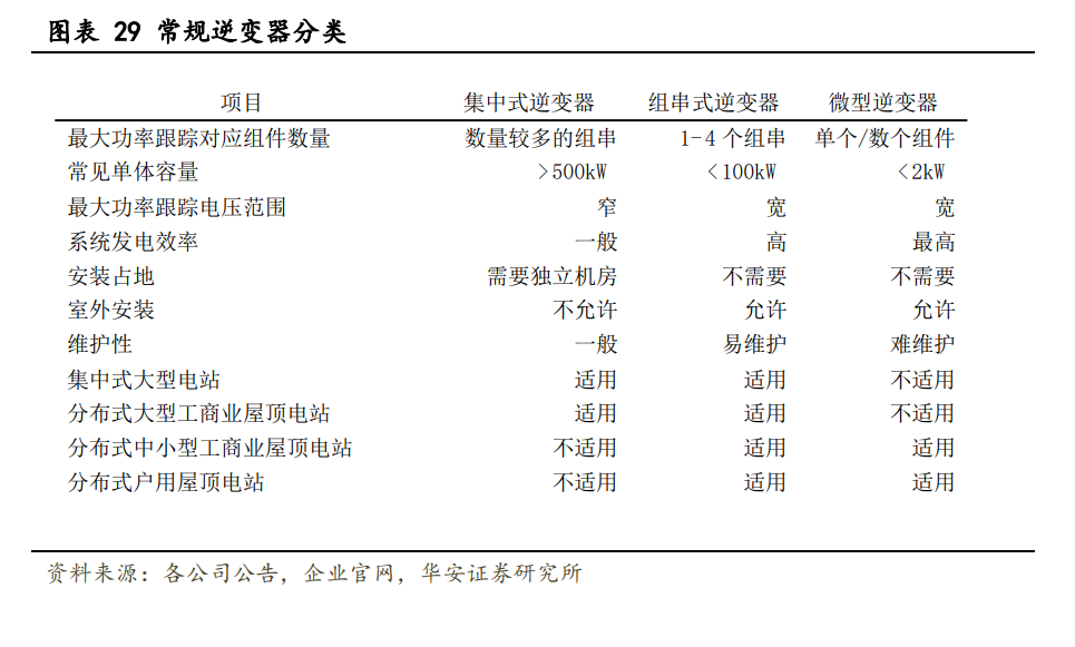 組串 PCS 彌補(bǔ)集中式不足,開啟規(guī)?;瘧?yīng)用。業(yè)內(nèi)目前電池儲能系統(tǒng)主要采取集中 式 PCS,多組電池并聯(lián)將引起電池簇之間的不均衡,久之并聯(lián)電池簇中會出現(xiàn)一部分電 池實際出力不足,而另一部分超出倍率使用的現(xiàn)象,造成“木桶”效應(yīng);而組串式 PCS 可 以實現(xiàn)簇級管理,提升系統(tǒng)壽命,提高全壽命周期放電容量,規(guī)?;瘧?yīng)用趨勢已見雛形。 當(dāng)前市場以組串式逆變器為主,微型逆變器尚處于發(fā)展階段。綜合考慮逆變器的不同技 術(shù)并結(jié)合其市場策略做出選擇的背景下,當(dāng)前組串式逆變器仍是市場較為主流選擇。目 前,華為、陽光電源、固德威、錦浪科技等光伏逆變器的核心供應(yīng)商均在組串式逆變器 有布局。而微型逆變器作為一種新的技術(shù)路線尚處于發(fā)展期,技術(shù)門檻較高,供應(yīng)商較 少。國外的微型逆變器市場發(fā)展較早,但出貨仍集中于海外龍頭 Enphase。我國微型逆變 器供應(yīng)商較少,一方面是因為國內(nèi)相關(guān)技術(shù)研發(fā)較晚,另一方面是因為國內(nèi)市場對于微 型逆變器的需求處于導(dǎo)入階段,尚未進(jìn)入放量階段。