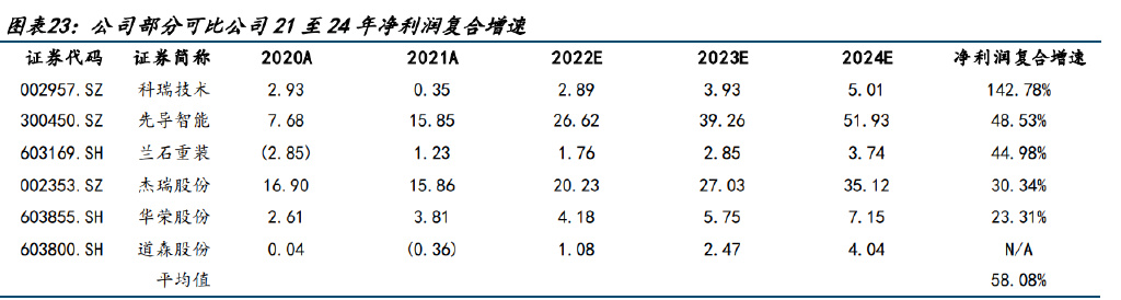 從部分有Wind一致預(yù)期的公司看,21至24年凈利潤復(fù)合增速5家企業(yè)平均值為54.85%, 其中蘭石重裝、先導(dǎo)智能預(yù)計復(fù)合增速分別約為 45%、49%,科瑞技術(shù)高達 143%,考慮其 余企業(yè)中仍有企業(yè)有望實現(xiàn)高復(fù)合增速,公司要超過 75 分位值水平(高于第五)預(yù)計凈 利潤復(fù)合增速較高,我們預(yù)計公司 21 至 24 年凈利潤復(fù)合增速為 49.69%。