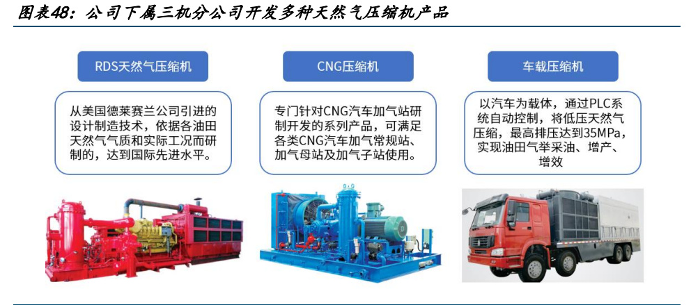 公司下屬三機分公司1982年進入壓縮機市場經(jīng)驗豐富,產(chǎn)品包括RDS系列天然氣壓縮機、 CNG 系列天然氣壓縮機等,產(chǎn)品可用于油氣井增產(chǎn)作業(yè)、CNG 汽車加氣站,主要應(yīng)用于中 石化、中石油、中海油及地方用戶市場。