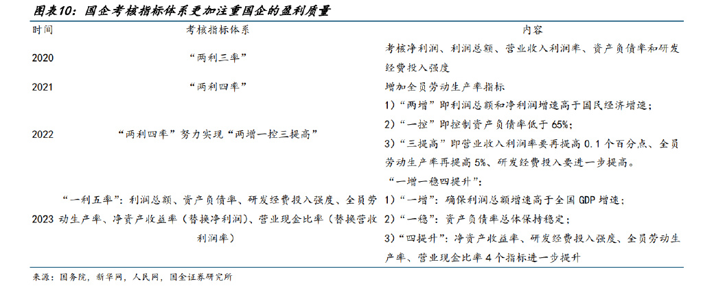 央企改革考核指標持續(xù)優(yōu)化,新一輪改革更加重視盈利質(zhì)量、抗風(fēng)險能力。新一輪央企考 核中將央企“一利五率”提出要求,即“一增一穩(wěn)四提升”,“一增”,即確保利潤總額增 速高于全國 GDP 增速,增大國資央企穩(wěn)定宏觀經(jīng)濟大盤的分量;“一穩(wěn)”,即資產(chǎn)負債率總 體保持穩(wěn)定;“四提升”,即凈資產(chǎn)收益率、研發(fā)經(jīng)費投入強度、全員勞動生產(chǎn)率、營業(yè)現(xiàn) 金比率 4 個指標進一步提升,新一輪央企改革更重視新增了 ROE 和現(xiàn)金流的考核,以凈資 產(chǎn)收益率(ROE)來替代營收利潤率,更加契合資本市場的風(fēng)格。 我們認為本輪國企改革,考核指標更注重盈利質(zhì)量、現(xiàn)金流的考核,代表央企盈利質(zhì)量有 望優(yōu)化,進一步提升公司競爭力和經(jīng)營質(zhì)量。