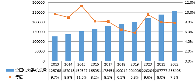 圖3 2013—2022年全國電力裝機(jī)及增速情況(單位:萬千瓦)