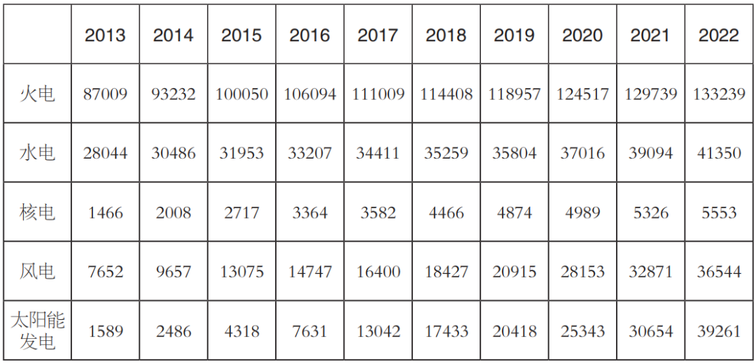 表4 2013-2022年全國電力裝機(jī)結(jié)構(gòu)(單位:萬千瓦)