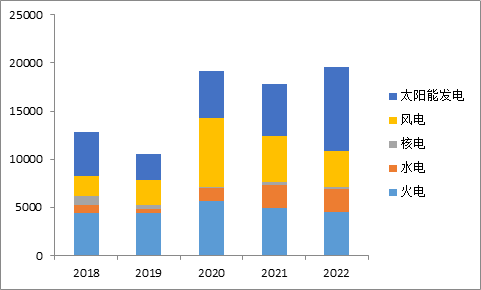 2018、2019兩年新增裝機(jī)規(guī)模連續(xù)下滑。2020年,在水電、風(fēng)電、太陽能發(fā)電裝機(jī)高速增長的帶動(dòng)下,新增裝機(jī)容量大幅提升。2021年受火電、風(fēng)電新增裝機(jī)容量減少的影響,整體新增規(guī)模同比出現(xiàn)下滑。2022年,在火電、核電、風(fēng)電新增裝機(jī)增速負(fù)增長情況下,太陽能發(fā)電新增裝機(jī)容量增速達(dá)約60%,拉高全年新增裝機(jī)增速。