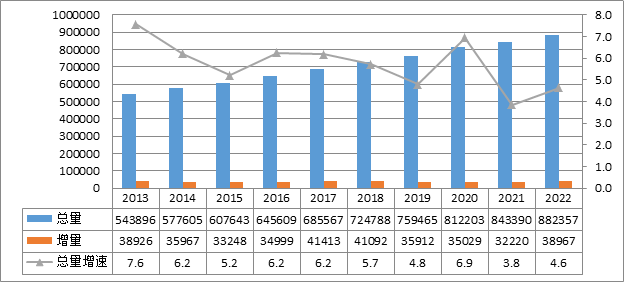 2022年,全國電網(wǎng)220千伏及以上變電設備容量共51.98億千伏安,同比增長5.2%;220千伏及以上輸電線路回路長度共88.2萬千米,同比增長4.6%。