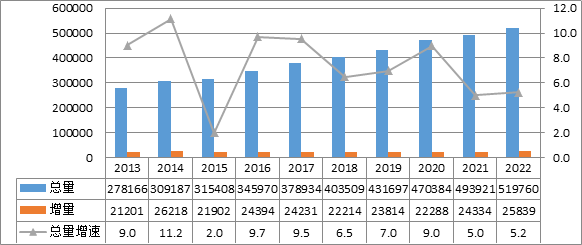 從新增量看,2022年全國新增220千伏及以上變電設備容量25839萬千伏安,比上年多投產(chǎn)1505萬千伏安,同比增長6.3%;新增220千伏及以上輸電線路長度38967千米,較上年多投產(chǎn)6747千米,同比增長21.2%。