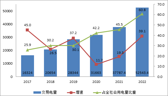 按交易結算口徑統(tǒng)計,2022年全國市場交易電量共5.25萬億千瓦時,同比增長39%,占全社會用電量比重達60.8%,同比提高15.4個百分點。其中,跨省跨區(qū)市場化交易電量首次超1萬億千瓦時,同比增長近50%。2022年國家電網(wǎng)經(jīng)營區(qū)域市場交易電量達4.16萬億千瓦時,同比增長42.7%;南方電網(wǎng)經(jīng)營區(qū)域市場交易電量0.85萬億千瓦時,同比增長27.4%;內蒙古電網(wǎng)經(jīng)營區(qū)域市場交易電量0.24萬億千瓦時,同比增長24.9%。在電力交易機構注冊的市場主體數(shù)量首次超過60萬家,同比增長29%。