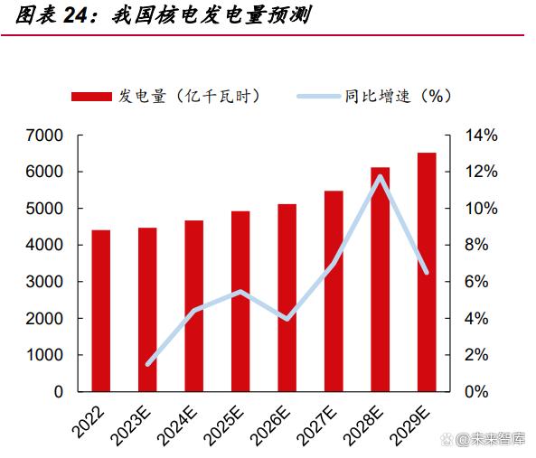 核電逐漸成為我國發(fā)電端的重要一環(huán)。根據(jù)中電聯(lián)預(yù)計,2023 年我國經(jīng)濟運行 有望總體回升,拉動電力消費需求增速比 2022 年有所提高。正常氣候情況下,預(yù)計 2023 年全國全社會用電量 9.15 萬億 kWh,比 2022 年增長 6%左右。預(yù)計 2023 年 底全國發(fā)電裝機容量 28.1 億 kW 左右,其中核電 5846 萬 kW。根據(jù)中國核能行業(yè)協(xié) 會預(yù)計,2035 和 2060 年,核能發(fā)電量在我國電力結(jié)構(gòu)中的占比分別需要達到 10% 和 20%左右,與當前 OECD 國家的平均水平相當。 核電裝機維持合理速度增長。我們對現(xiàn)有在運、在建、核準項目進行測算,由于 2016-2018 年沒有新項目核準,因此 2023-2026 年我國核電裝機增速相對減緩,同 時由于 2019-2022 年恢復(fù)正常核準且 2022 年核準達 10 臺機組,因此核電裝機有望 在 2027-2029 年達到小高潮,至 2029 年底達 8365.7 萬 kW,2023-2029 年七年我 國核電裝機 CAGR 達 6.0%。根據(jù)我國核電建設(shè)進度,以及法國按照電力結(jié)構(gòu) PPE 計劃每年關(guān)閉同等數(shù)量的核電機組,我國在運核電機組數(shù)量預(yù)計在 2024 年超過法國 達到世界第二位。