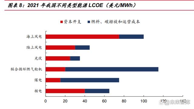 核電項目初期建設(shè)投資高,但綜合考慮運營、燃料、廢物處理費用后的全生命周 期成本后,競爭力凸顯。即使三代核電造價提升,其經(jīng)濟性仍然很強。而且國內(nèi)核電 設(shè)計壽命 40-60 年有余量,到期后一般會申請延壽 20 年,進一步增強了核電的盈利 能力。用平準化度電成本 LCOE 來評測,根據(jù) IEA 測算,2021 年我國壓水堆核電站 LCOE 約為 65 美元/MWh,僅次于光伏的 35 美元/MWh 和陸風(fēng)的 45 美元/MWh,且 相對煤電具有優(yōu)勢。作為基荷能源,考慮長期運營成本,從成本端對火電、燃氣發(fā)電 擁有極強替代能力。
