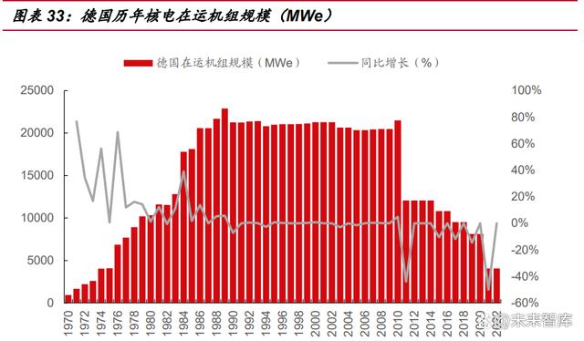 核事故安全問題引發(fā)民眾反對態(tài)度,德國核電走出倒 U 型曲線。同樣受到 1974 年能源危機(jī)影響,能源獨立問題受到關(guān)注,德國大力發(fā)展核電,直到 1989 年前德國 核電裝機(jī)都處于快速增長狀態(tài)。1986 年切爾諾貝利事故后,德國核電發(fā)展陷入停滯, 最后一座新核電站于 1989 年投入使用。 2011 年福島核事故后,德國走上了堅定退核的道路。到 2011 年初,德國 17 座 核電機(jī)組規(guī)模 21.5GW,占總電源裝機(jī)容量的 15%,核電發(fā)電量比例接近 30%。2011 年 12 月福島核電站事故后,德國多臺核電機(jī)組關(guān)停,2011 年底核電在運規(guī)模驟降至12.1GW,2022 年底僅余 3 臺機(jī)組。規(guī)模 4.1GW。受俄烏事件和北溪管道事故影響, 德國宣布暫緩核電退出計劃,推遲關(guān)停原定 2022 年內(nèi)退役的 3 座核電站。