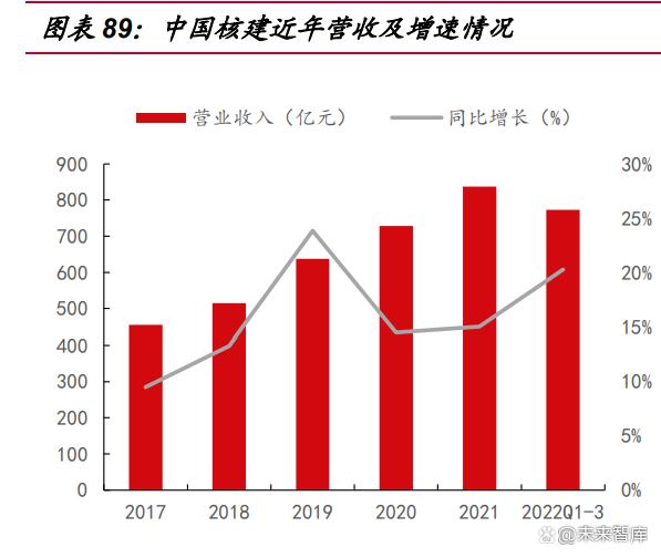 中國(guó)核建成立于 2010 年,于 2016 年上市,主營(yíng)業(yè)務(wù)為核電工程、工業(yè)和民用 工程建設(shè),2018 年中核建設(shè)集團(tuán)與中核集團(tuán)實(shí)行戰(zhàn)略重組推動(dòng)企業(yè)改革。公司正高 水平推進(jìn) “國(guó)際熱核聚變實(shí)驗(yàn)堆”項(xiàng)目建設(shè),已成功實(shí)現(xiàn)主機(jī)安裝第一階段任務(wù),國(guó)際 品牌影響力顯著提升。公司 2022 年非公開(kāi)發(fā)行募集資金約 25 億元投入建筑工程項(xiàng) 目,拓寬民用工程業(yè)務(wù)布局。 2022 年公司收入穩(wěn)健增長(zhǎng),2022 年前三季度公司實(shí)現(xiàn)營(yíng)業(yè)收入 772.8 億元,同 比上升 20.3%,歸母凈利潤(rùn) 12.8 億元,同比上升 22.8%。根據(jù)公司經(jīng)營(yíng)情況簡(jiǎn)報(bào), 2022 年全年?duì)I業(yè)收入 981.4 億元,同比上升 17.2%,據(jù)此計(jì)算,2022 年第四季度營(yíng) 業(yè)收入 208.6 億元,同比上升 7.2%。訂單方面,公司 2022 年前三季度累計(jì)新增訂 單 995.2 億元,同比提升 2%,根據(jù) 2022 年 12 月發(fā)布的公開(kāi)投資者調(diào)研情況公告披 露,2022 年全國(guó)共核準(zhǔn) 10 臺(tái)核電機(jī)組,8 臺(tái)已完成招投標(biāo),公司全部參與且全部中 標(biāo),剩余 2 臺(tái)仍在投標(biāo)前期階段,公司有望憑借高資質(zhì)、豐富的建造經(jīng)驗(yàn),持續(xù)中標(biāo) 核島工程訂單。