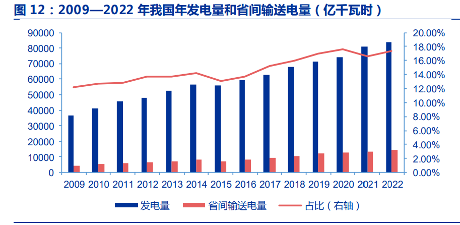 前面提到,由于歷史沿革原因,我國大陸地區(qū)除內(nèi)蒙古和河北外,每個(gè)省級行政區(qū)均 設(shè)有 1 個(gè)省級電網(wǎng),加上內(nèi)蒙古自治區(qū)的蒙東、蒙西和河北的冀北、河北南網(wǎng) 4 個(gè)省級電 網(wǎng),共有 33 個(gè)省級電網(wǎng),大部分電力的生產(chǎn)和消納均在省內(nèi)完成。我國跨省輸電電量穩(wěn)步 提升,從 2009 年的 4459 億千瓦時(shí)上升至 2022 年的 14610 億千瓦時(shí),增加約 3 倍,占 比也從 12.2%提升到 17.4%,2022 年全年發(fā)電量約 8.4 萬億千瓦時(shí)。