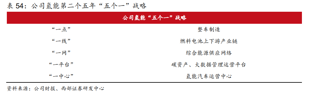 率先布局氫能全產(chǎn)業(yè)鏈,全面啟動“五個一”戰(zhàn)略。公司于 2017 年在氫能產(chǎn)業(yè)鏈領(lǐng)先廣 泛布局,至 2021 年完成氫能發(fā)展的第一個五年規(guī)劃,目前已經(jīng)搭建了上游氫氣的“制-儲運-加”氫能供應(yīng)體系、中游“膜電極-燃料電池電堆及系統(tǒng)-整車制造”核心裝備產(chǎn)業(yè)鏈,以及 下游六大區(qū)域氫能示范應(yīng)用的三 維格局,形成從研發(fā)—生產(chǎn)制造—商業(yè)化應(yīng)用的“氫能源 全生命周期”創(chuàng)新生態(tài)鏈。2022 年,公司啟動氫能產(chǎn)業(yè)第二個五年計劃,確立“五個一”戰(zhàn) 略。