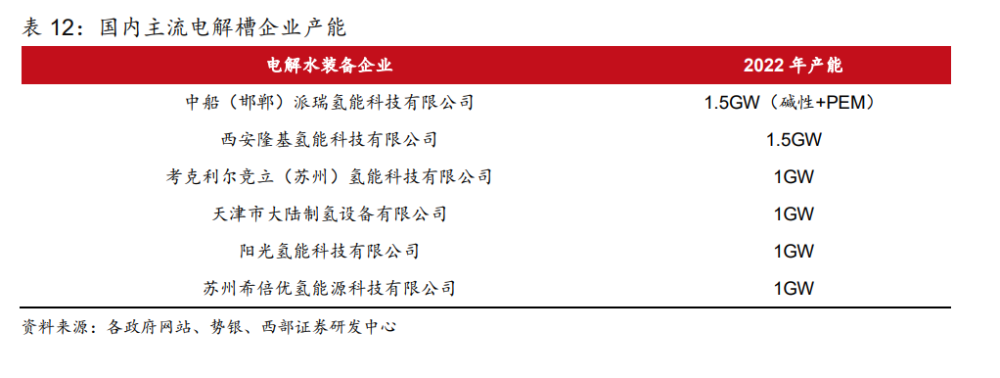 電解水制氫是指水分子在直流電作用下被解離生成氧氣和氫氣,分別從電解槽陽極和陰極 析出。根據(jù)工作原理和電解質(zhì)的不同,電解水制氫技術(shù)通常分為四種,分別是堿性電解水 技術(shù)(ALK)、質(zhì)子交換膜電解水技術(shù)(PEM)、高溫固體氧化物電解水技術(shù)(SOEC)和 固體聚合物陰離子交換膜電解水技術(shù)(AEM)。 電解水制氫技術(shù)以堿性電解為主,PEM 電解次之。“雙碳”目標(biāo)提出后,國內(nèi)電解水制氫 項目規(guī)劃和推進(jìn)逐步加快,2022 年國內(nèi)堿性電解槽企業(yè)已披露產(chǎn)能接近 11GW,堿性電 解水制氫技術(shù)已完成商業(yè)化進(jìn)程,產(chǎn)業(yè)鏈發(fā)展成熟,且具備成本優(yōu)勢,已實現(xiàn)大規(guī)模應(yīng)用; PEM 電解水技術(shù)則處于商業(yè)化初期,產(chǎn)業(yè)鏈國產(chǎn)化程度不足,電解槽雙極板、膜材料以及 鉑、銥等貴金屬催化劑材料成本更高且極度依賴進(jìn)口;高溫固體氧化物電解水技術(shù)和固體 聚合物陰離子交換膜電解水技術(shù)還處于研發(fā)示范階段,未實現(xiàn)商業(yè)化應(yīng)用。