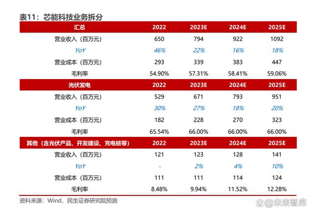 芯能科技業(yè)務拆分: 22 年業(yè)務結構收入占比:光伏發(fā)電(81%)+光伏產品(12%)+開發(fā)建設(4%) +充電樁(1%)+其他業(yè)務(1%)。其中光伏產品、開發(fā)建設主要以配套光伏發(fā)電 業(yè)務為主。 光伏發(fā)電業(yè)務:受益于大工業(yè)電價同比上調以及公司自持電站規(guī)模持續(xù)擴大、光伏 發(fā)電量穩(wěn)步增加,同時,在分布式光伏整縣推進背景下,EPC 及運維服務業(yè)務的市 場空間進一步打開,公司光伏發(fā)電業(yè)務穩(wěn)定增長。根據公司轉債問詢函回復,未來 三年公司計劃以分布式光伏并網裝機容量不低于 15%的年化增長率持續(xù)擴大自持分布式光伏電站建設投入,我們預計公司光伏發(fā)電業(yè)務 23-25 年收入增速分別為 27%/18%/20%。