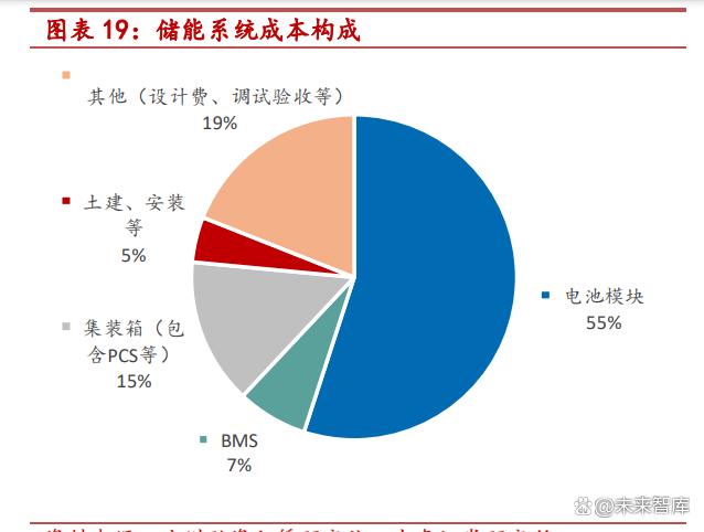 電池為儲(chǔ)能系統(tǒng)第一大成本。儲(chǔ)能系統(tǒng)成本主要由五部分構(gòu)成:電池模 塊、BMS 系統(tǒng)、集裝箱(含 PCS 等)、土建及安裝費(fèi)用、其他設(shè)計(jì)調(diào)試 費(fèi)。以浙江省一工廠(chǎng)的 3MW/6.88MWh 儲(chǔ)能系統(tǒng)成本為例,電池模塊占總 成本的 55%。