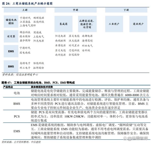 工商業(yè)儲(chǔ)能系統(tǒng)產(chǎn)業(yè)鏈完善,與大儲(chǔ)、戶儲(chǔ)同源。上游是各類設(shè)備,中游是系統(tǒng)集成商和開發(fā)運(yùn)營商,下游是工商業(yè)運(yùn)營商。上游部件環(huán)節(jié)中,儲(chǔ)能電池模組由電芯經(jīng)過串并聯(lián)組成用以儲(chǔ)存電力;逆變器進(jìn)行交流電與直流電的轉(zhuǎn)換,根據(jù)功率指令對電池進(jìn)行充放電;BMS 是控制、管理電池各項(xiàng)功能并保護(hù)電池的核心部件,亦具備和 EMS、SCADA(能量管理系統(tǒng)及監(jiān)控系統(tǒng))通訊功能,目前也有部分電池廠家開始自主設(shè)計(jì) BMS;EMS 控制逆變器并采集逆變器數(shù)據(jù)、控制電池模組并采集電芯數(shù)據(jù)、執(zhí)行邏輯(各種應(yīng)用)并與其他設(shè)備集成調(diào)度。中游集成商與品牌渠道商直接與下游工商業(yè)用戶對接,需要對BMS/EMS 系統(tǒng)及儲(chǔ)能應(yīng)用場景有著高理解,且 BMS/EMS 系統(tǒng)基本為自研,以完成對上游設(shè)備的高效整合。