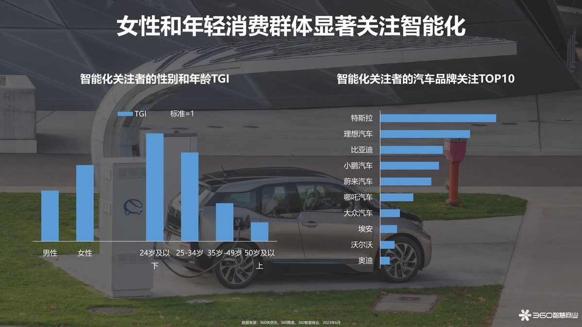 在關(guān)注新能源汽車的360用戶中,34歲以下用戶占比有絕對優(yōu)勢,對新能源汽車關(guān)注度也高于汽車行業(yè)整體。與此同時(shí)年輕群體對于技術(shù)迭代和新技術(shù)的應(yīng)用也抱有極大熱情,“智能化”是他們與新能源汽車行業(yè)間又一堅(jiān)固鏈接,值得一提的是,對于新能源汽車的智能化,年輕女性群體展示出了更高的偏好度。