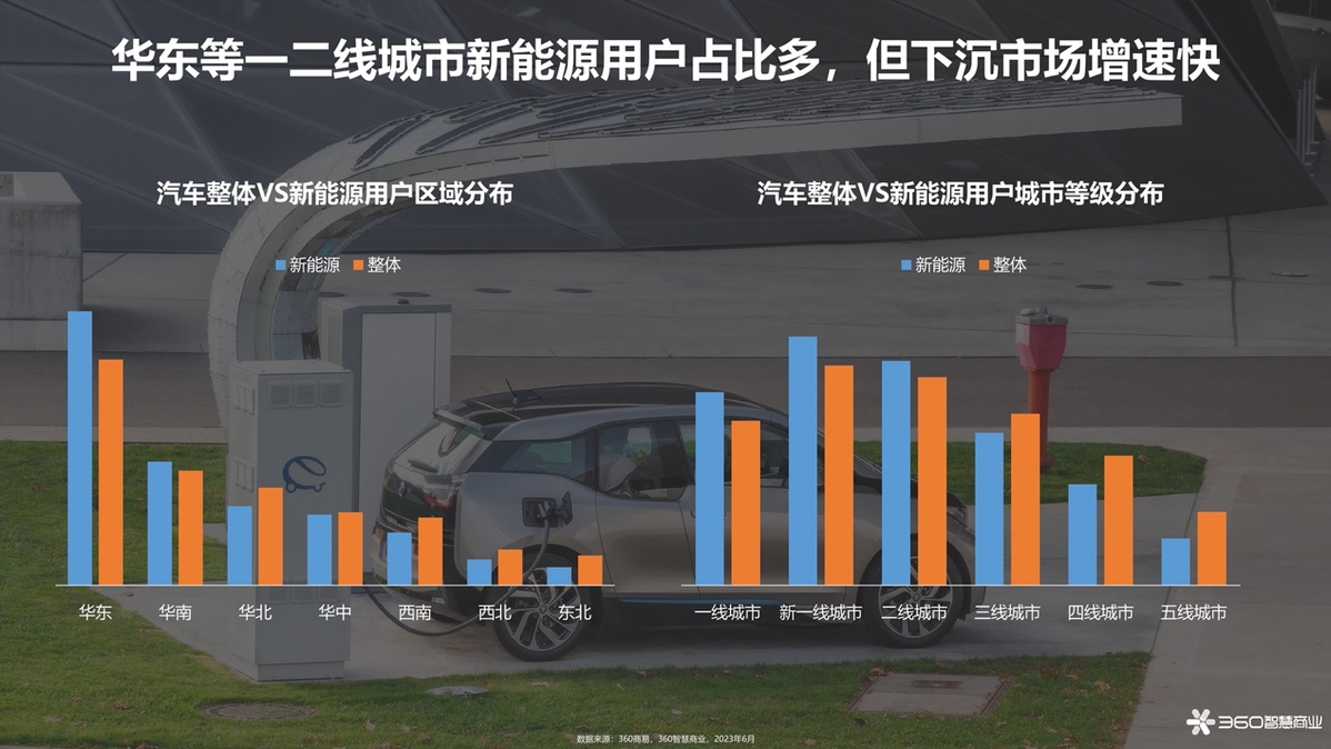 進(jìn)入2023年,新能源汽車更是進(jìn)入全面迅猛發(fā)展的階段,銷量穩(wěn)步持續(xù)提升。在地域分布上,華東、華南等氣候較溫暖地區(qū)新能源汽車用戶占比最高,而極易遭遇嚴(yán)寒天氣的西北、東北地區(qū),用戶占比最少,展示出顯著的地域分布特點(diǎn)。而在城市等級分布中,報(bào)告顯示,三、四、五線城市中,新能源汽車和汽車整體的用戶數(shù)量差距正在縮小,更多消費(fèi)者對新能源汽車的態(tài)度已由謹(jǐn)慎觀望轉(zhuǎn)變?yōu)橹鲃訐肀А?/p>