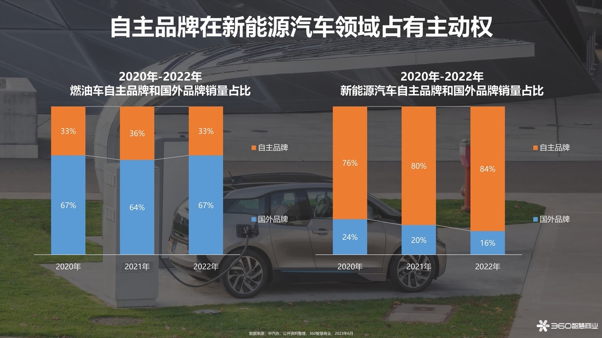 而與這一趨勢相應(yīng)的是我國新能源汽車自主品牌的興起,相較于老牌的汽車廠商,我國自主品牌在向電動化轉(zhuǎn)型的進(jìn)程中更加輕便且有政策扶持,獲得了迅猛的發(fā)展。2022年,新能源汽車銷量中,自主品牌占比高達(dá)84%,遠(yuǎn)超國外品牌。