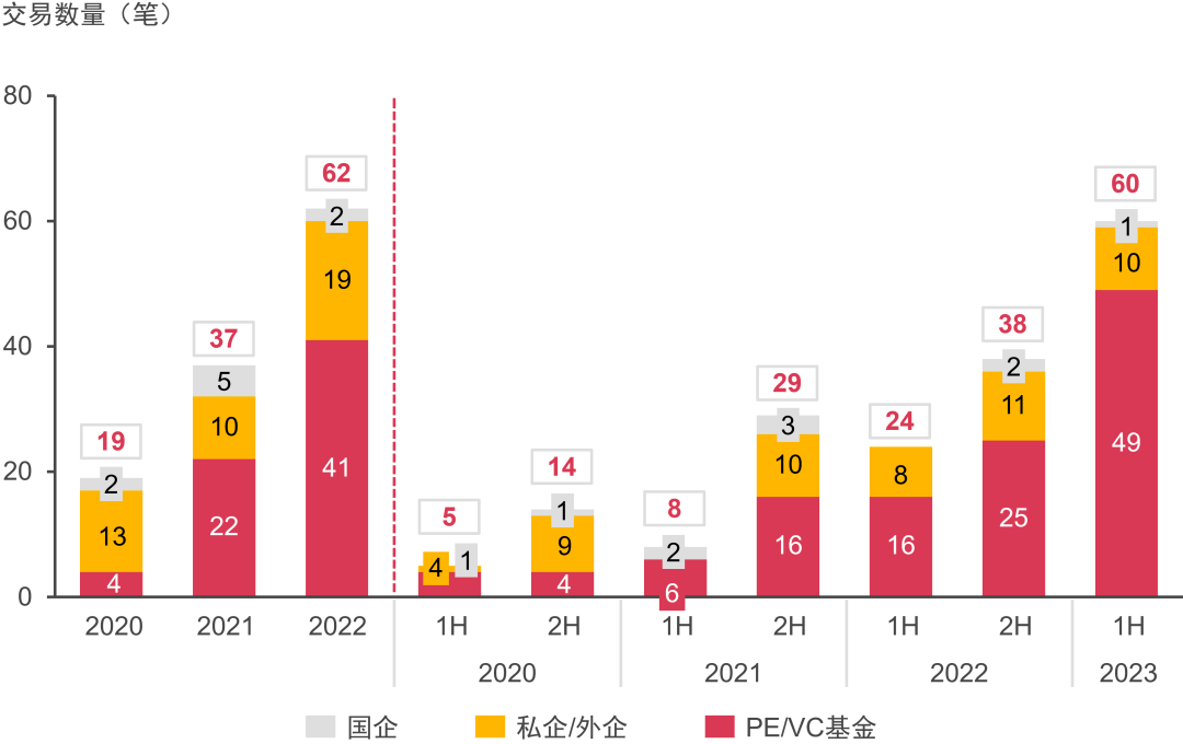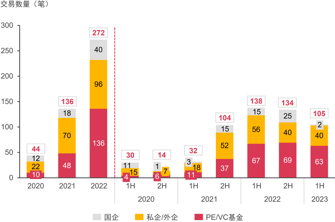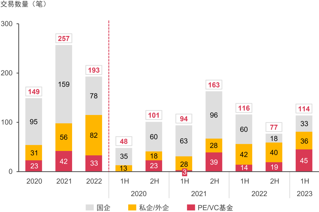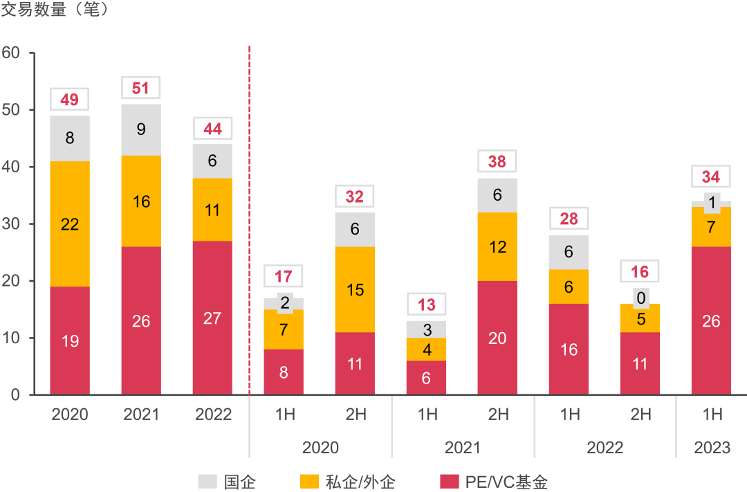 國企整體投資熱度有所下降,上半年僅有兩筆交易;顯示出國企對于行業(yè)成熟度提高后的投資謹(jǐn)慎性。
