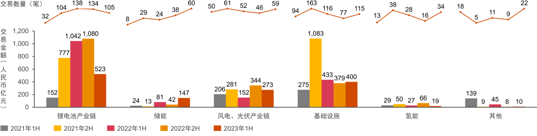 2021-2023年上半年中國新能源行業(yè)并購交易金額及數(shù)量(按細(xì)分賽道)
