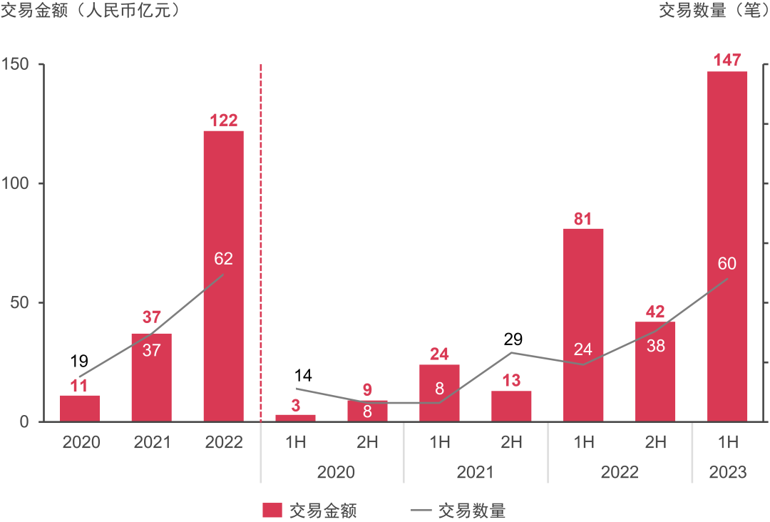 2020年至2023年上半年基礎(chǔ)設(shè)施交易金額及數(shù)量