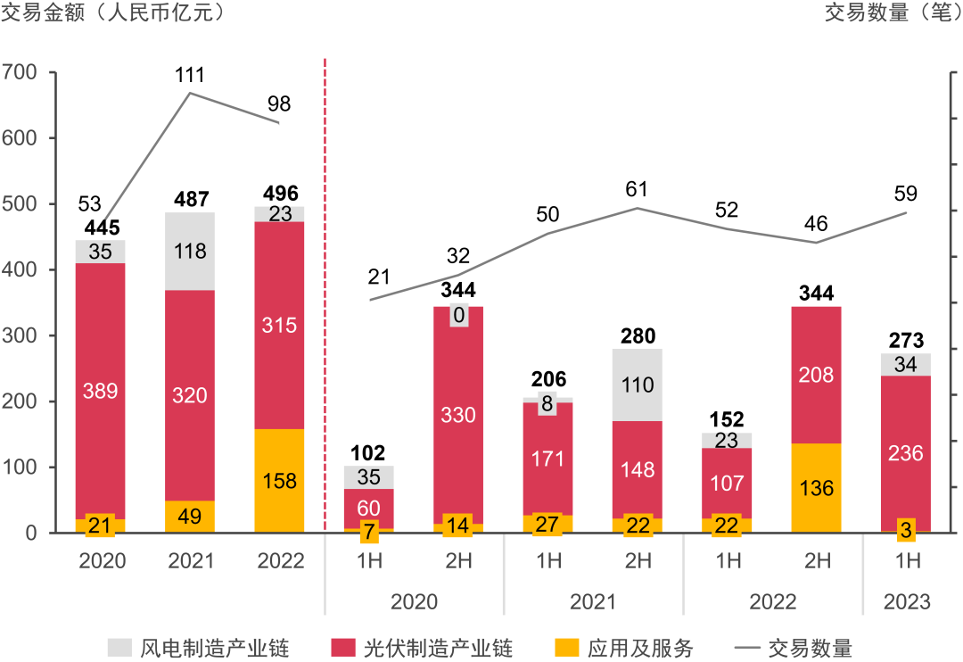 2020年至2023年上半年風(fēng)電及光伏產(chǎn)業(yè)鏈并購交易數(shù)量及金額