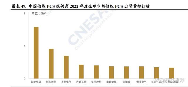 當前儲能 PCS 生產(chǎn)廠商眾多,與光伏逆變器廠商高度重合。儲能變流器與光伏逆變器的最主要 作用都是實現(xiàn)交直流的轉(zhuǎn)換,所以兩種產(chǎn)品的主要零部件類似,且在應用端也開始呈現(xiàn)高度的協(xié) 同效應。在光伏 PCS 已經(jīng)取得非常大的市場規(guī)模的前提下,未來儲能 PCS 的競爭格局與光伏逆 變器趨同,延續(xù)光伏 PCS 格局。當前儲能 PCS 行業(yè)賽道參與者眾多,來自光伏逆變器、不間斷 電源(UPS)、充電樁(EV charger)、電網(wǎng)側(cè)-輸配電設備(PTD、MVD、APF、SVG)等多領 域廠商。據(jù) CNESA 數(shù)據(jù),2022 年度全球市場中儲能 PCS 出貨量排名前十位的中國儲能 PCS 提 供商,依次為陽光電源、科華數(shù)能、上能電氣、古瑞瓦特、盛弘股份、南瑞繼保、固德威、索英 電氣、匯川技術和首航新能源。