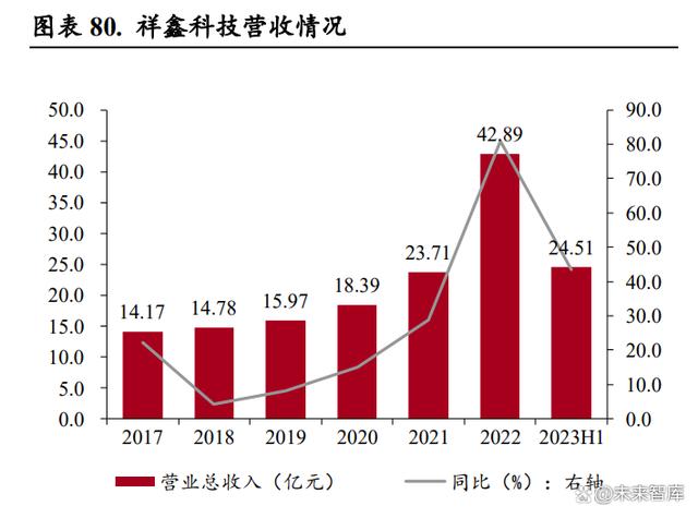 公司營收增長迅速,新能源、儲能精密沖壓模具及金屬結構件貢獻營收逐年增加。公司營業(yè)收入從 2017 年的 14.17 億元增加到 2022 年的 42.89 億元,年均復合增長率達到 24.80%,2023 年上半年實現(xiàn)營業(yè)收入 24.51 億元,同比增長 43.38%。分產(chǎn)品來看,2019 年以來新能源汽車零部件和儲能設備 結構件業(yè)務占總營收比例明顯提升,其中 2022 年新能源汽車產(chǎn)品收入占比達 59.62%,成為公司主 要的收入來源,給公司帶來新的收入增長點。