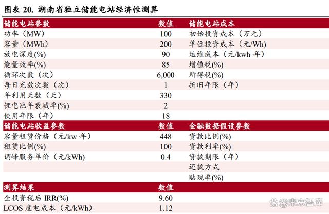 獨立儲能電站經(jīng)濟性可觀。我們以湖南省的實際情況為例,來測算獨立儲能電站的經(jīng)濟性,在目前 的各種條件下,湖南省獨立儲能電站的全投資稅后 IRR 達到 9.60%,具有客觀的收益性。 1)容量租賃收入假設:參考湖南省的城步儒林 100MW/200MWh 儲能電站項目已經(jīng)簽訂的容量租賃 合同,湖南省的容量租賃價格為 448 元/kw*年。2)電力輔助服務收入假設:電力輔助服務包括為電網(wǎng)公司提供調(diào)峰、調(diào)頻等服務,按照每次調(diào)用規(guī) 模及調(diào)用次數(shù),電網(wǎng)公司給儲能電站支付費用。 參考湖南省的現(xiàn)行 政 策以及城步儒林 100MW/200MWh 儲能電站項目的運行情況,假設一年調(diào)用 330 天,每天一次充放,調(diào)用費用為每 次 400 元/MWh。