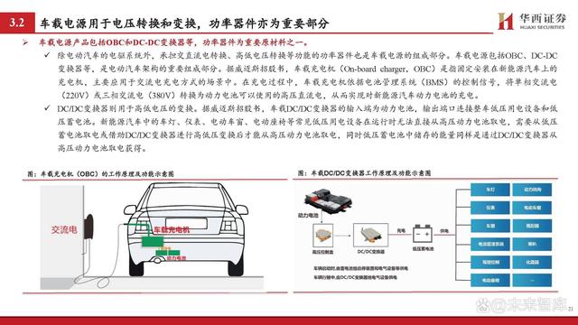車載電源產(chǎn)品包括OBC和DC-DC變換器等,功率器件為重要原材料之一。 除電動汽車的電驅(qū)系統(tǒng)外,承擔(dān)交直流電轉(zhuǎn)換、高低電壓轉(zhuǎn)換等功能的功率器件也是車載電源的組成部分。車載電源包括OBC、DC-DC 變換器等,是電動汽車架構(gòu)的重要組成部分。據(jù)威邁斯招股書,車載充電機(jī)(On-board charger,OBC)是指固定安裝在新能源汽車上的 充電機(jī),主要應(yīng)用于交流電充電方式的場景中。在充電過程中,車載充電機(jī)依據(jù)電池管理系統(tǒng)(BMS)的控制信號,將單相交流電 (220V)或三相交流電(380V)轉(zhuǎn)換為動力電池可以使用的高壓直流電,從而實(shí)現(xiàn)對新能源汽車動力電池的充電。 DC/DC變換器則用于高低電壓的變換。據(jù)威邁斯招股書,車載DC/DC變換器的輸入端為動力電池,輸出端口連接整車低壓用電設(shè)備和低 壓蓄電池。新能源汽車中的車燈、儀表、電動車窗、電動座椅等常見低壓用電設(shè)備在運(yùn)行時無法直接從高壓動力電池取電,需要從低壓 蓄電池取電或借助DC/DC變換器進(jìn)行高低壓變換后才能從高壓動力電池取電,同時低壓蓄電池中儲存的能量同樣是通過DC/DC變換器從 高壓動力電池取電獲得。