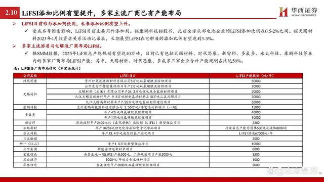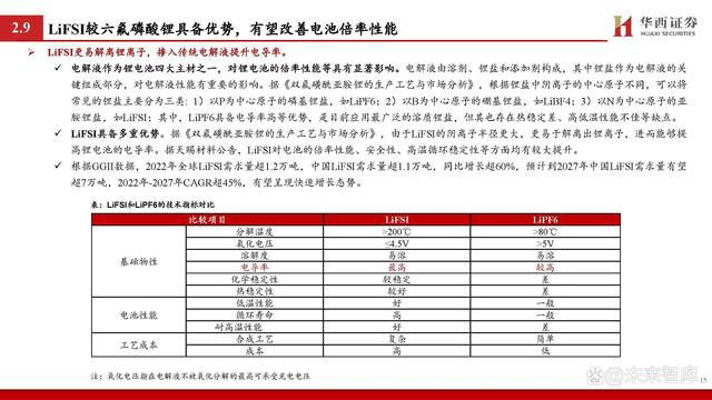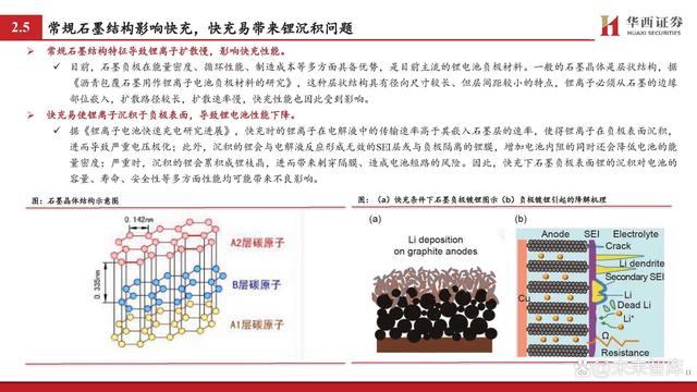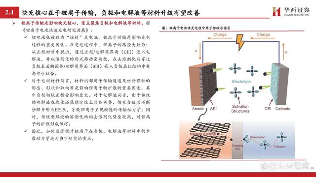 鋰離子傳輸是影響快充核心,重點(diǎn)聚焦負(fù)極和電解液等材料。據(jù) 《鋰離子電池快速充電研究進(jìn)展》: 鋰電池也被稱為“搖椅”式電池,鋰離子傳輸是影響充電 過程的重要因素。在充電過程中,鋰離子的路徑大致為: 從正極材料中脫出,通過正極/電解質(zhì)界面(CEI)進(jìn)入電 解液,并以溶劑化的形式移動至負(fù)極,在去溶劑化后穿過 負(fù)極表面的固體/電解質(zhì)界面(SEI)嵌入負(fù)極層狀結(jié)構(gòu)中并 與電子結(jié)合。 對于電極材料而言,材料內(nèi)部離子傳輸通道及材料顆粒的 形態(tài)、形狀和取向等是影響鋰離子的擴(kuò)散的重要因素,其 中負(fù)極相較正極受影響更大。對于電解液而言,由于傳統(tǒng) 的電解液在氧化還原穩(wěn)定性上具備劣勢,快充會使其不斷 分解并形成EEI層,導(dǎo)致鋰離子呈現(xiàn)較慢的傳輸動力學(xué);同 時,傳統(tǒng)電解液的溶劑化結(jié)構(gòu)去溶劑化勢壘較高,對鋰離 子的擴(kuò)散形成阻礙。 因此,如何顯著提升鋰離子在負(fù)極、電解液等材料中的擴(kuò) 散動力學(xué)成為當(dāng)下研究的重點(diǎn)。