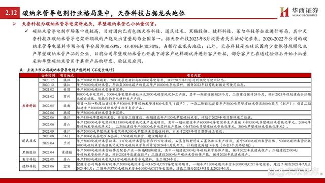 導(dǎo)電劑加速離子&電子移動速率,碳納米管較常規(guī)導(dǎo)電劑性能更優(yōu)。除鋰電池主材外,導(dǎo)電劑作為鋰電池的材料構(gòu)成中的關(guān)鍵輔材,同樣影響著鋰電池的倍率性能。據(jù)GGII,導(dǎo)電劑在活性物質(zhì)之間、活性 物質(zhì)與集流體之間起到收集微電流的作用,以減小電極的接觸電阻并加速電子的移動速率,同時也能有效提高鋰離子在電極材料中的遷 移速率,從而提高電極的充放電效率。 據(jù)GGII,目前市場上應(yīng)用的鋰電池導(dǎo)電劑包括以炭黑、導(dǎo)電石墨為代表的常規(guī)導(dǎo)電劑和以碳納米管、石墨烯為代表的新型導(dǎo)電劑。據(jù)天 奈科技招股書,相較于常規(guī)導(dǎo)電劑的代表炭黑,碳納米管具有更好的導(dǎo)電性能,并能夠使鋰電池保持良好的電子和離子傳導(dǎo);此外,碳 納米管憑借其較高長徑比的特性,相較于炭黑能夠進(jìn)一步提高鋰電池的倍率性能。據(jù)GGII預(yù)計(jì),在高倍率電池需求增加等因素的推動下, 新型導(dǎo)電劑將在未來幾年逐步替代傳統(tǒng)導(dǎo)電劑,其中碳納米管有望成為市場主流。此外,碳納米管一般分為單壁和多壁碳納米管,單壁 碳納米管因?yàn)殚L徑比更大,從而擁有更優(yōu)的理化性能和導(dǎo)電性能,有望成為碳納米管未來的重點(diǎn)發(fā)展方向。