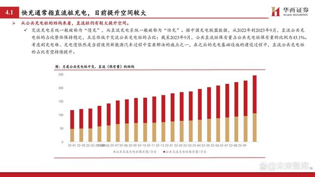 從公共充電樁的結(jié)構(gòu)來看,直流樁仍有較大提升空間。 交流充電系統(tǒng)一般被稱為“慢充”,而直流充電系統(tǒng)一般被稱為“快充”。據(jù)中國充電聯(lián)盟數(shù)據(jù),從2022年到2023年9月,直流公共充 電樁的占比整體保持穩(wěn)定,且總體低于交流公共充電樁的占比;截至2023年9月,公共直流樁保有量占公共充電樁保有量的比例為43.1%。 考慮到充電難、充電慢依然是當(dāng)前使用新能源汽車過程中需要解決的痛點(diǎn)之一,在之后的充電基礎(chǔ)設(shè)施的建設(shè)過程中,直流公共充電樁 的占比有望持續(xù)提升。