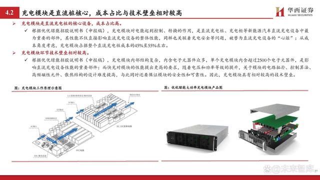 充電模塊是直流充電樁的核心設(shè)備,成本占比高。 根據(jù)優(yōu)優(yōu)綠能招股說明書(申報(bào)稿),充電模塊對電能起到控制、轉(zhuǎn)換的作用,是直流充電樁、充電柜等新能源汽車直流充電設(shè)備中最 為重要的部件,其性能不僅直接影響直流充電設(shè)備的整體性能,同樣也關(guān)聯(lián)著充電安全等問題,被譽(yù)為直流充電設(shè)備的“心臟”;從成 本角度考慮,充電模塊占據(jù)整個直流充電樁成本的45%至55%左右。