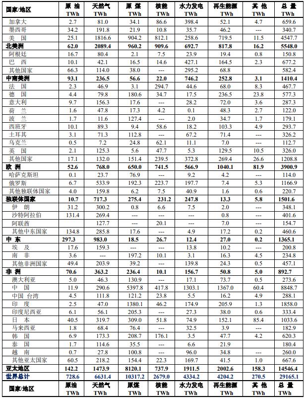 表1、 2022年世界各國電力結(jié)構(gòu)(以TWh表示)