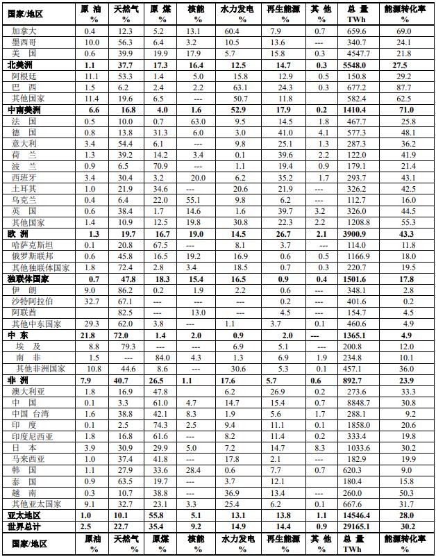 從表1世界各國電力結(jié)構(gòu)可以看出:
