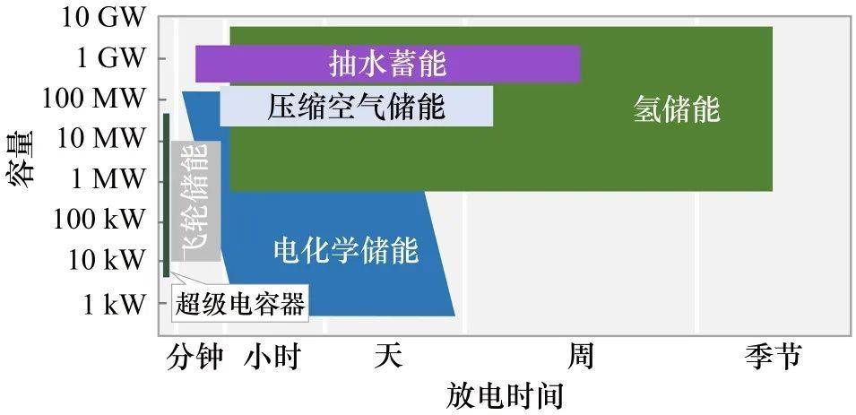 ?、僭谛履茉聪{方面,氫儲能在放電時間(小時至季度)和容量規(guī)模(百吉瓦級別)上的優(yōu)勢比其他儲能明顯,如圖1所示;