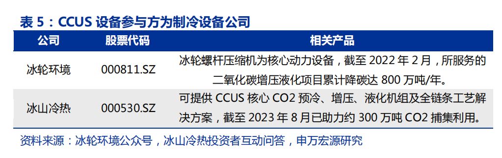 2)藍(lán)氫:在化石能源制氫基礎(chǔ)上增添碳捕集設(shè)備,至2025 年需增設(shè)年捕集量2000 萬(wàn)噸的CCUS 設(shè)備,核心動(dòng)力裝置為螺桿壓縮機(jī),廠商主要包括冰輪環(huán)境、冰山冷熱;