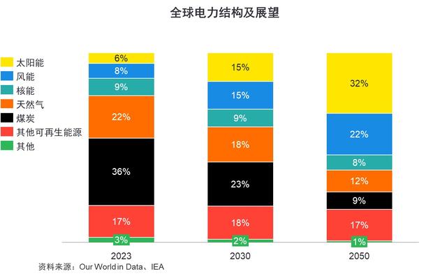 縱觀全球電力結(jié)構(gòu),2023年石油、煤炭和天然氣三大傳統(tǒng)能源仍占主導(dǎo)地位,占比高達(dá)61%,可再生能源占比約為39%,其中太陽能發(fā)電僅占6%。全球電力結(jié)構(gòu)正面臨深刻變革,根據(jù)國際能源署(IEA)預(yù)測(cè),到2030年,傳統(tǒng)能源發(fā)電主導(dǎo)地位受到挑戰(zhàn);到2050年,可再生能源將成為電力結(jié)構(gòu)的主力軍,占比高達(dá)79%,其中太陽能發(fā)電預(yù)計(jì)將達(dá)到32%。