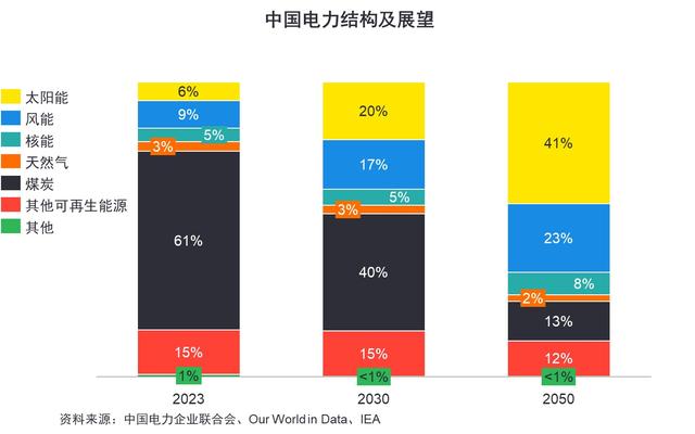2023年,中國電力供應(yīng)結(jié)構(gòu)中傳統(tǒng)能源發(fā)電占比65%,可再生能源發(fā)電占比35%,其中光伏發(fā)電占比僅6%。據(jù)國際能源署(IEA)預(yù)測(cè),2050年76%的電力供應(yīng)將來自于可再生能源,其中光伏占比為41%。屆時(shí),光伏將成為中國構(gòu)建以新能源為主的新型電力系統(tǒng)的核心力量之一。