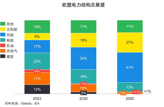 作為全球應(yīng)對(duì)氣候變化的引領(lǐng)者和光伏技術(shù)的策源地,歐盟在可再生能源領(lǐng)域展現(xiàn)出了不俗表現(xiàn)。2023年歐盟的光伏裝機(jī)總量達(dá)到了263吉瓦,位居世界第二。在歐盟的電力供應(yīng)結(jié)構(gòu)中,新能源發(fā)電占比高達(dá)67%,其中光伏發(fā)電占9%。據(jù)國際能源署(IEA)預(yù)測(cè),到2030年,新能源發(fā)電比例將進(jìn)一步提升至86%,而光伏占比預(yù)計(jì)將提升至19%,到2050年,光伏占比預(yù)計(jì)進(jìn)一步提升至27%。