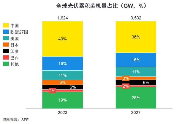 據(jù)歐洲光伏協(xié)會(huì)(SPE)數(shù)據(jù)顯示,2023年全球光伏裝機(jī)總量已達(dá)1624吉瓦,在中等情景預(yù)測(cè)下,2027年全球裝機(jī)總量將顯著增長至3532吉瓦,復(fù)合增長率將高達(dá)21%。從區(qū)域來看,2023年中國以656吉瓦的光伏累計(jì)裝機(jī)容量穩(wěn)居全球第一,占比為40%,歐盟和美國緊隨其后,裝機(jī)容量分別為263吉瓦、173吉瓦。根據(jù)歐洲光伏協(xié)會(huì)(SPE)預(yù)測(cè),到2027年,全球光伏裝機(jī)格局預(yù)計(jì)保持不變。值得關(guān)注的是,過去幾年,中國、美國和巴西的光伏裝機(jī)容量增長速度均超過了全球平均增速27%,其中巴西光伏因其裝機(jī)容量基數(shù)較小,其增速更是達(dá)到了74%的驚人速度。
