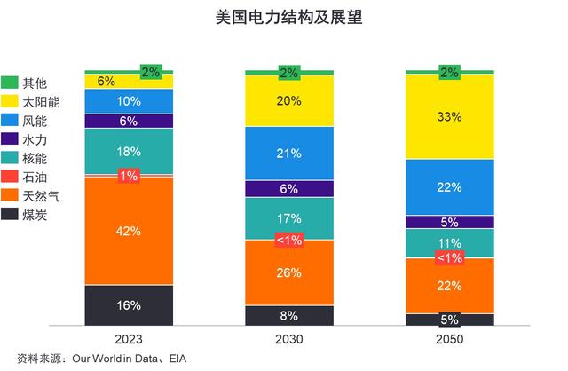 作為以油氣為主的能源大國,2023年美國電力供應(yīng)結(jié)構(gòu)中傳統(tǒng)能源發(fā)電占比59%,新能源發(fā)電占比41%,其中光伏發(fā)電占比僅6%。這距離美國“3550”計(jì)劃[2]中提出的2035年實(shí)現(xiàn)無碳發(fā)電的目標(biāo)還有很大距離。對(duì)美國而言,發(fā)展光伏是其能源結(jié)構(gòu)調(diào)整的重要一環(huán),也是進(jìn)一步穩(wěn)固其能源強(qiáng)國地位的必要手段。據(jù)美國能源署(EIA)預(yù)測(cè),到2030年,66%的電力供應(yīng)將來自于新能源,其中光伏占比提升至20%,到2050年,73%的電力供應(yīng)將來自于新能源,其中光伏占比大幅提升至33%。